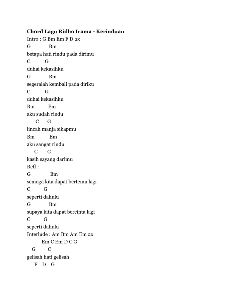Chord Gitar dan Video Kerinduan Ridho Rhoma. Setelah sukses dengan lagu Menunggu Ridho kembali dengan lagu Kerinduan. Chord Ridho Rhoma Kerinduan - intro G Bm Em F D G Bm Em F D G Bm betapa hati rindu pada dirimu C G duhai kekasihku G Bm segeralah kembali pada diriku C G duhai kekasihku Bm Em aku sudah rindu C G lincah manja sikapmu Bm Em aku sangat rindu C G kasih sayang darimu G Bm semoga kita dapat bertemu lagi C G seperti dahulu G Bm supaya kita dapat bercinta lagi C G seperti dahulu.
