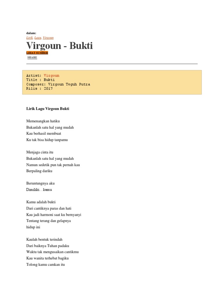 Lirik Lagu Virgoun Bukti. Semua yang jadi bukti tersimpan di dalam palung hati. Memenangkan hatiku bukanlah Satu hal yang mudah Kau berhasil membuat Ku tak bisa hidup ta.